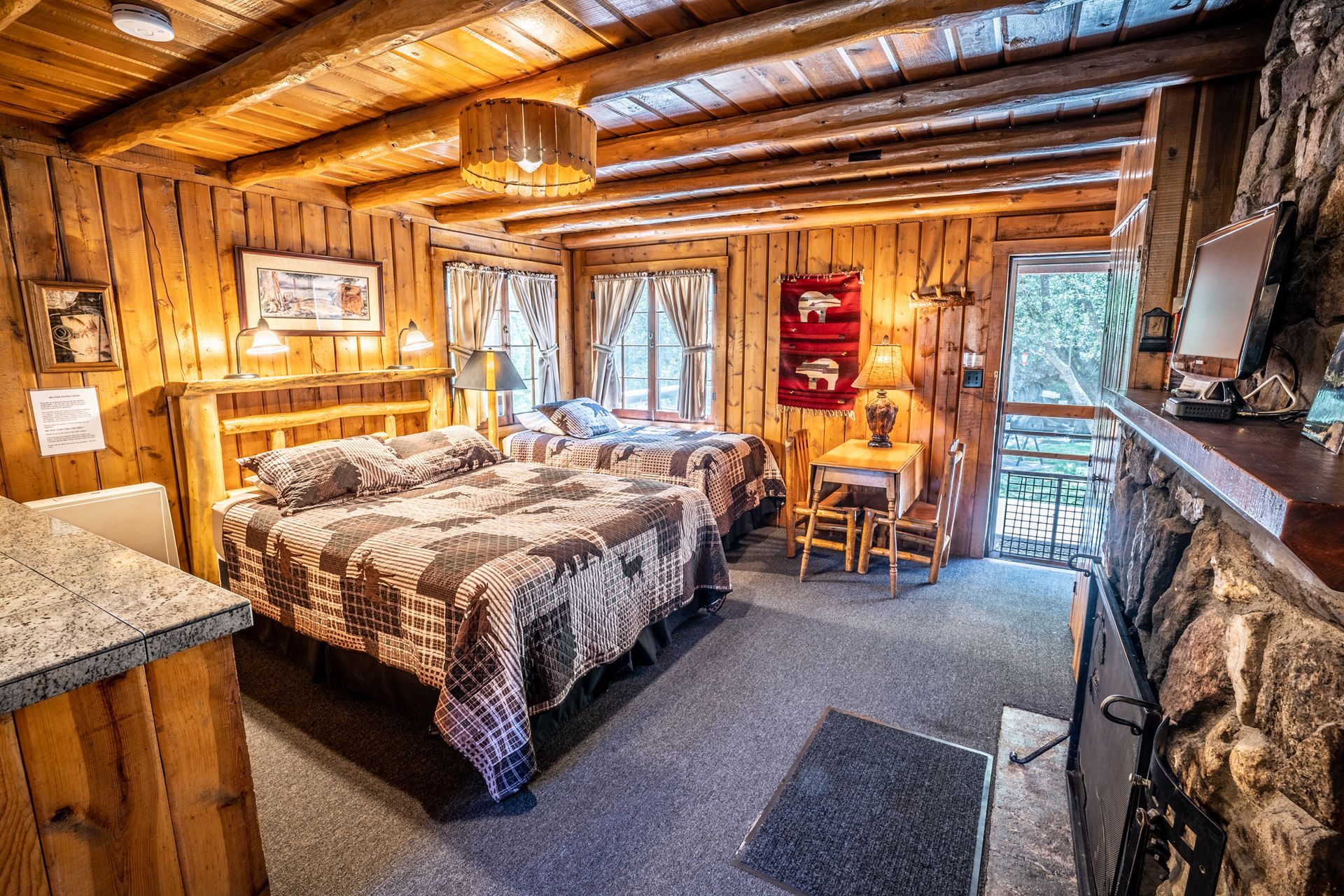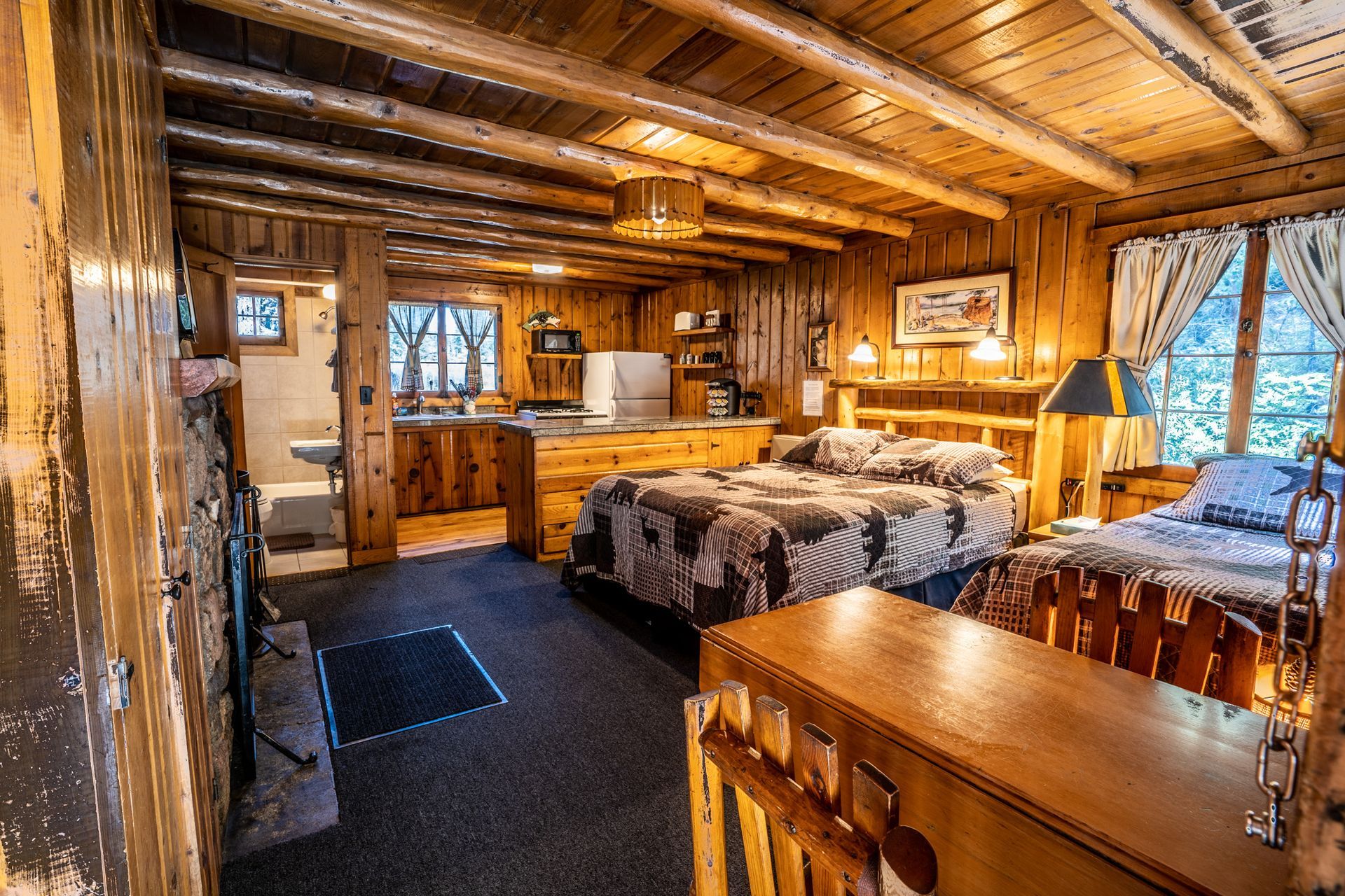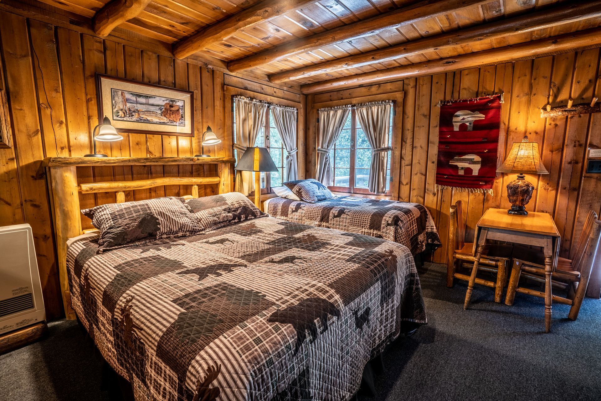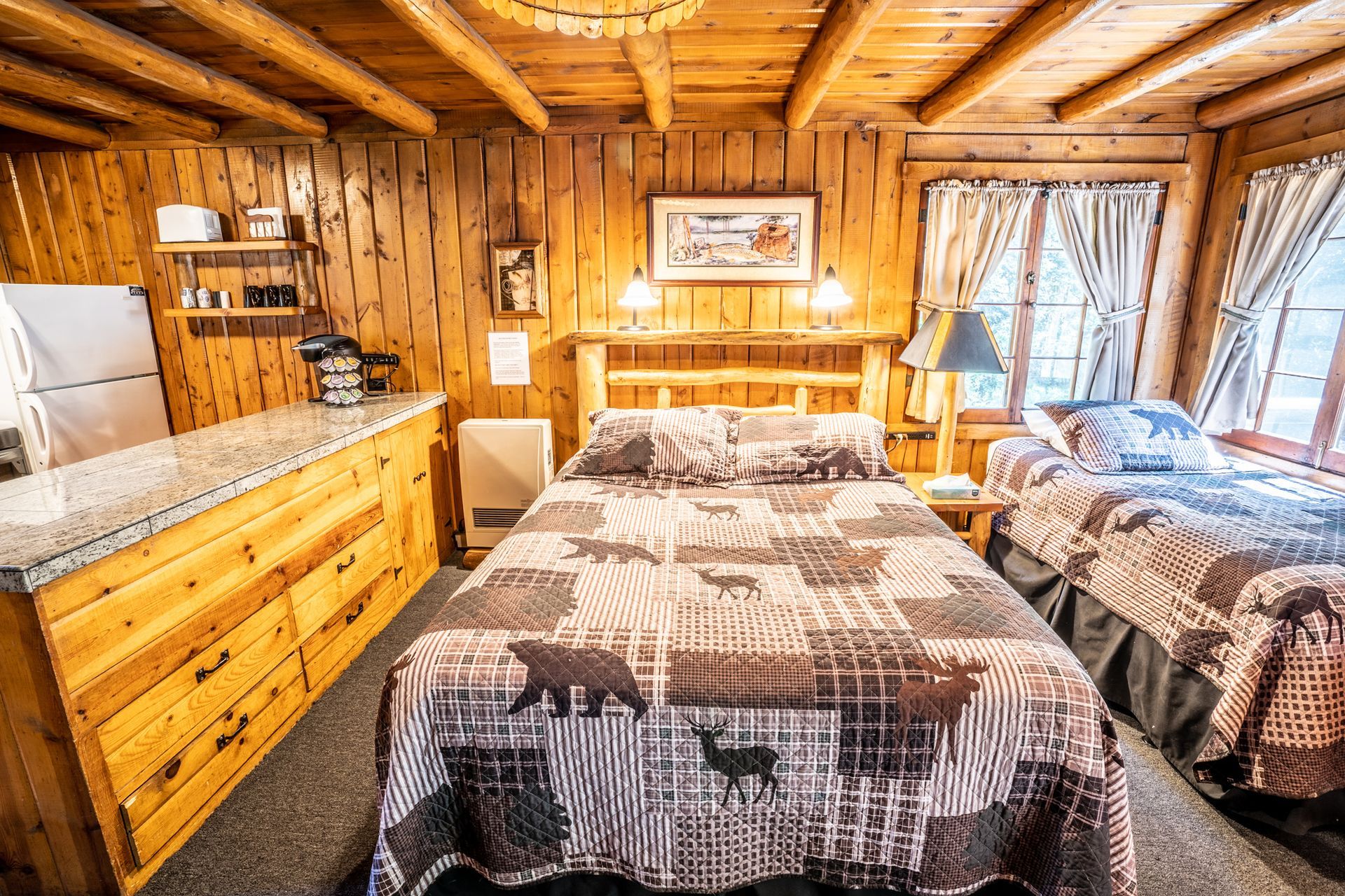 Each Individual Cabin consists of one 350 square foot room with one queen bed and one twin bed. The Individual Cabin walls are log beam and each bed has a unique handcrafted pine headboard.