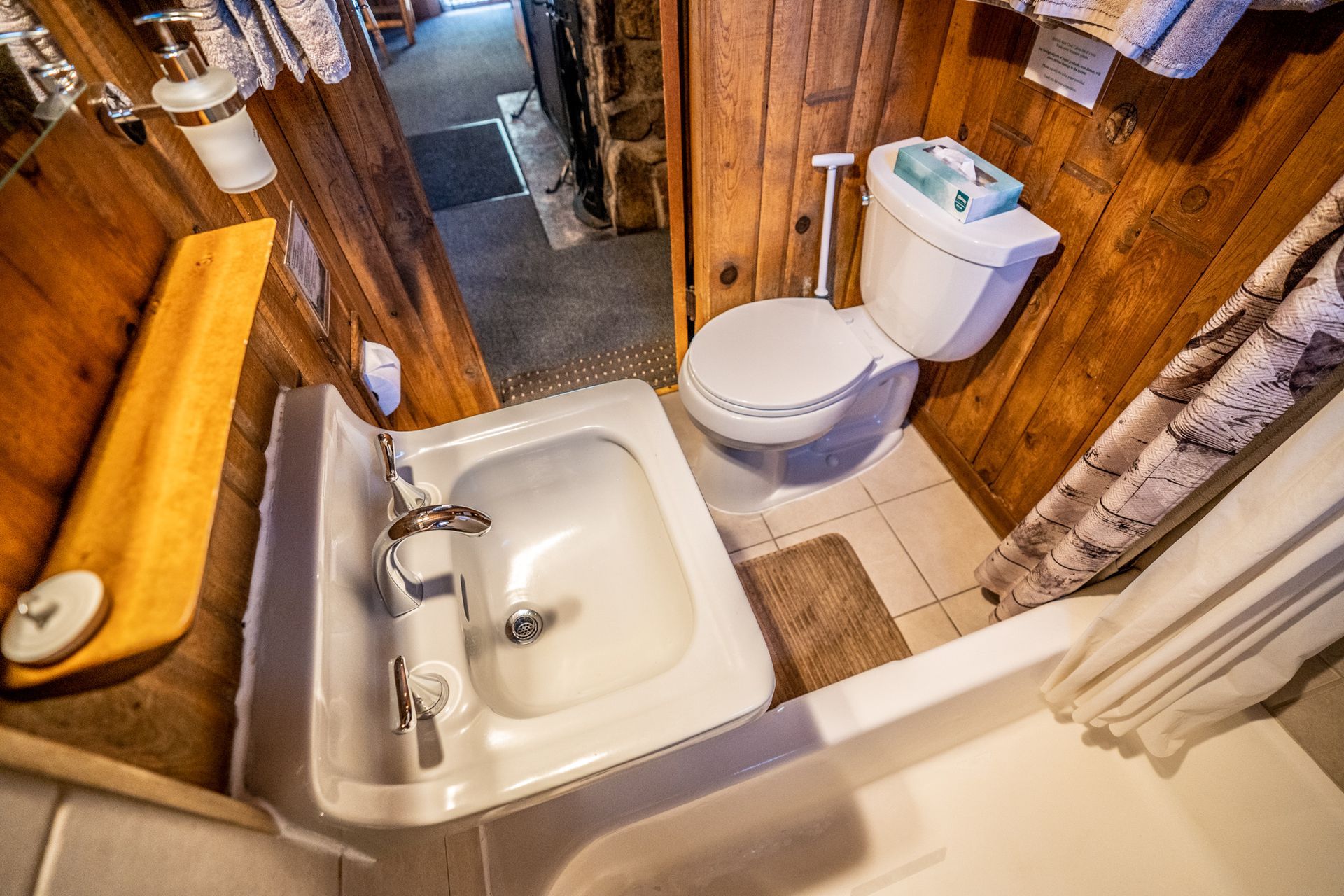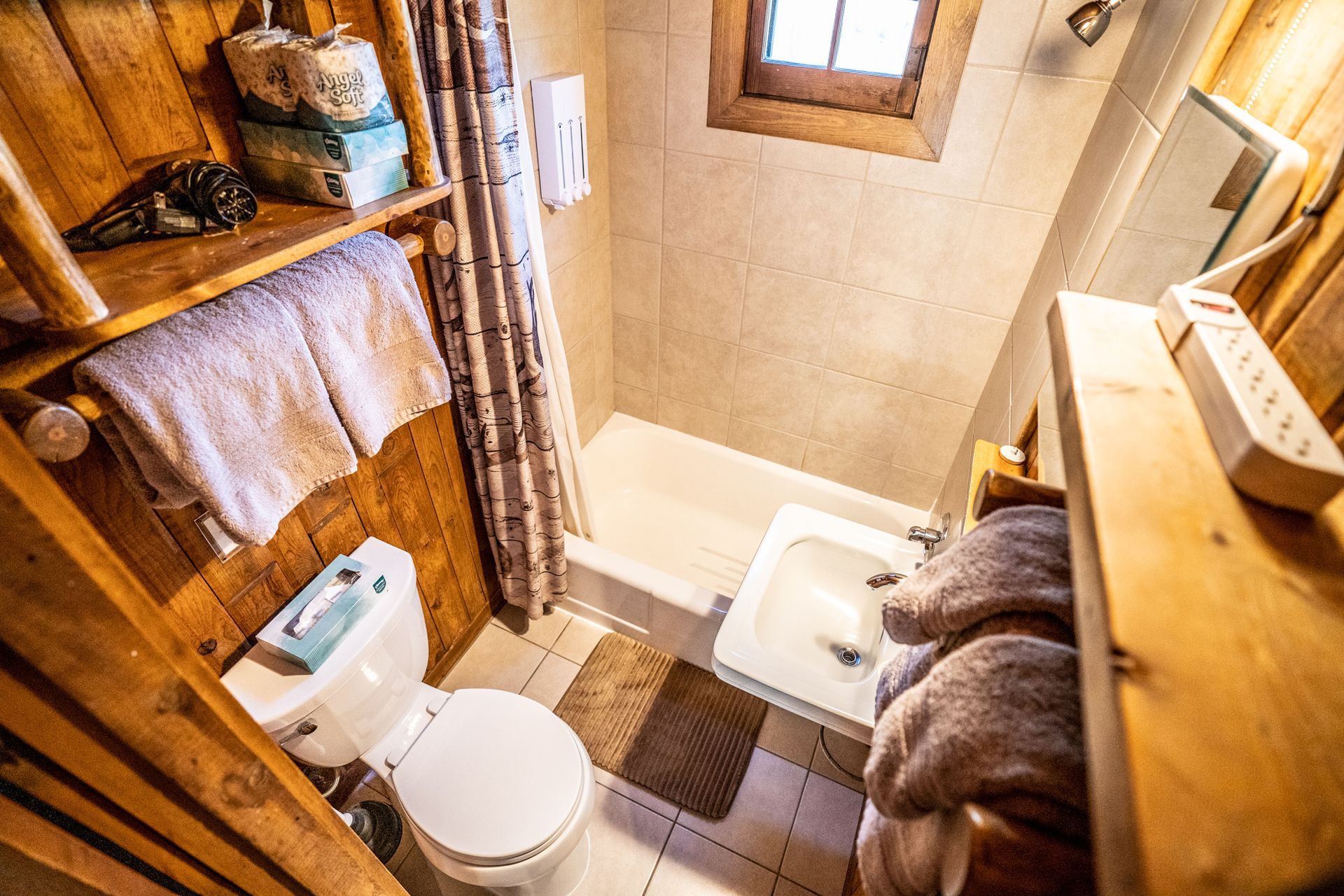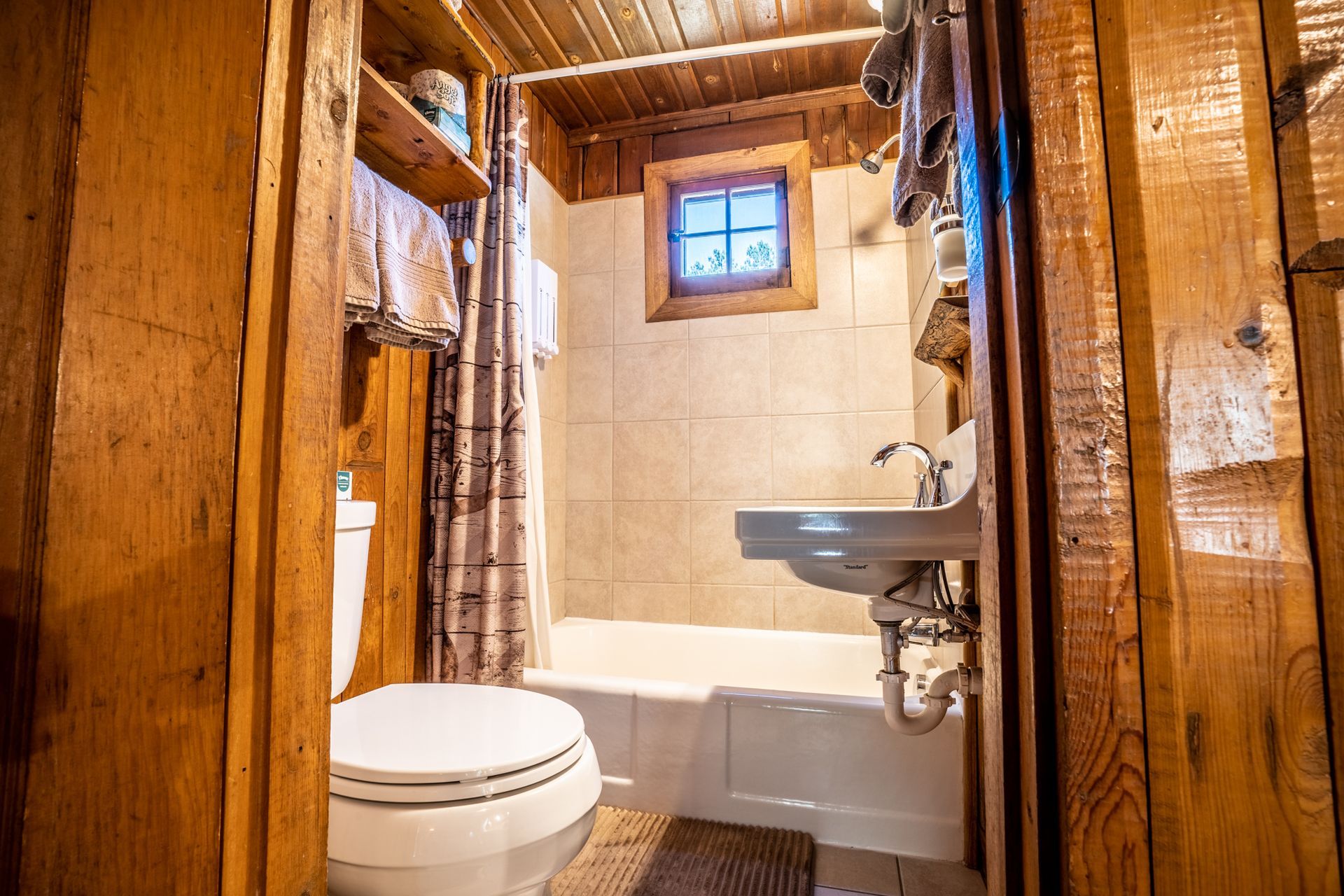 All Individual Cabins have a full kitchen equipped with a sink, stove, oven, microwave, toaster, refrigerator, coffee maker, and breakfast table with two chairs. The utensils, cookware, dishes, and coffee are provided in each Individual Cabin. Each Individual Cabin also has a tub/shower bathroom with a hair dryer. All Individual Cabins have a flat screen television with access to cable and streaming services, as well as 1 Gbps / 35 Mbps WiFi connectivity. Additionally, each Individual Cabin is equipped with a wood burning fireplace and a wall heater. In addition to the indoors, the Individual Cabins have an outside deck with seating, a gorgeous shared outdoor space along Bear Creek with seating and picnic tables, as well as charcoal grills. The Individual Cabins ARE pet friendly ($50 pet fee for the entire stay).